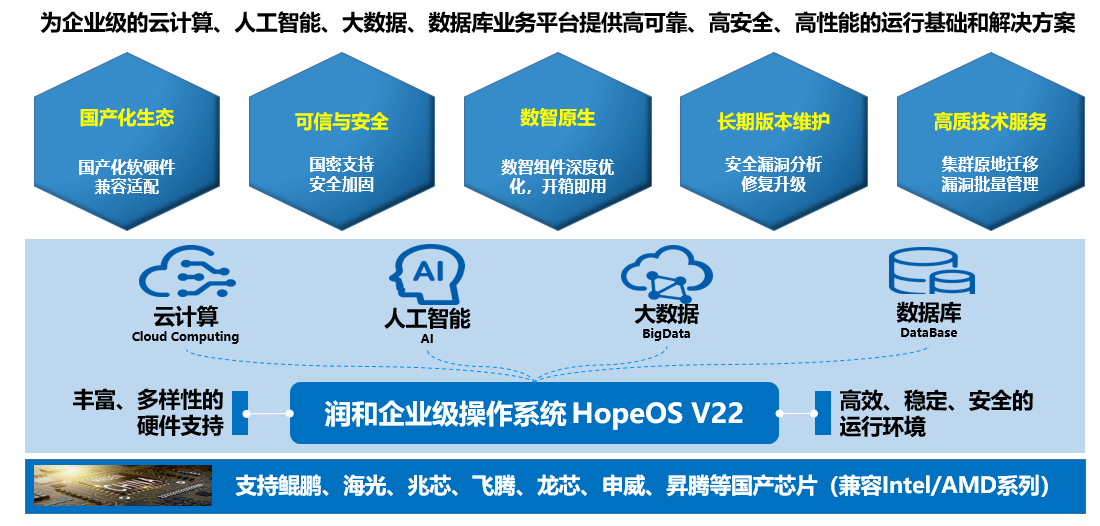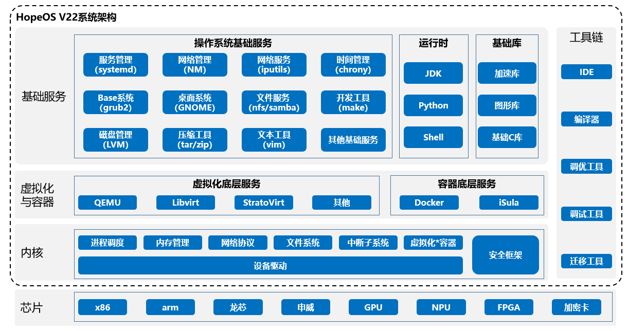 HopeOS V22同源支持Intel/AMD、鯤鵬、海光、飛騰、兆芯、龍芯和申威等芯片,適配兼容昇騰和英偉達智能算力,兼容國產主流硬件整機與中間件軟件產品,支持服務器、云計算、邊緣計算等應用場景。HopeOS V22為應急安全、能源電力、金融、教育等各類國計民生行業提供全國產化基礎軟件棧。