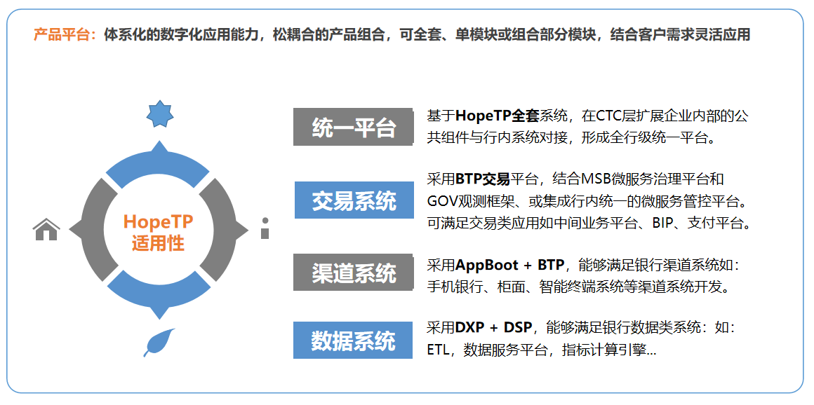 基于 HopeTP 上的應(yīng)用自動(dòng)具備“業(yè)務(wù)、數(shù)據(jù)、智能”實(shí)時(shí)閉環(huán)的特性,松耦合可組合的平臺(tái)模塊,適配多種數(shù)字化應(yīng)用場景。