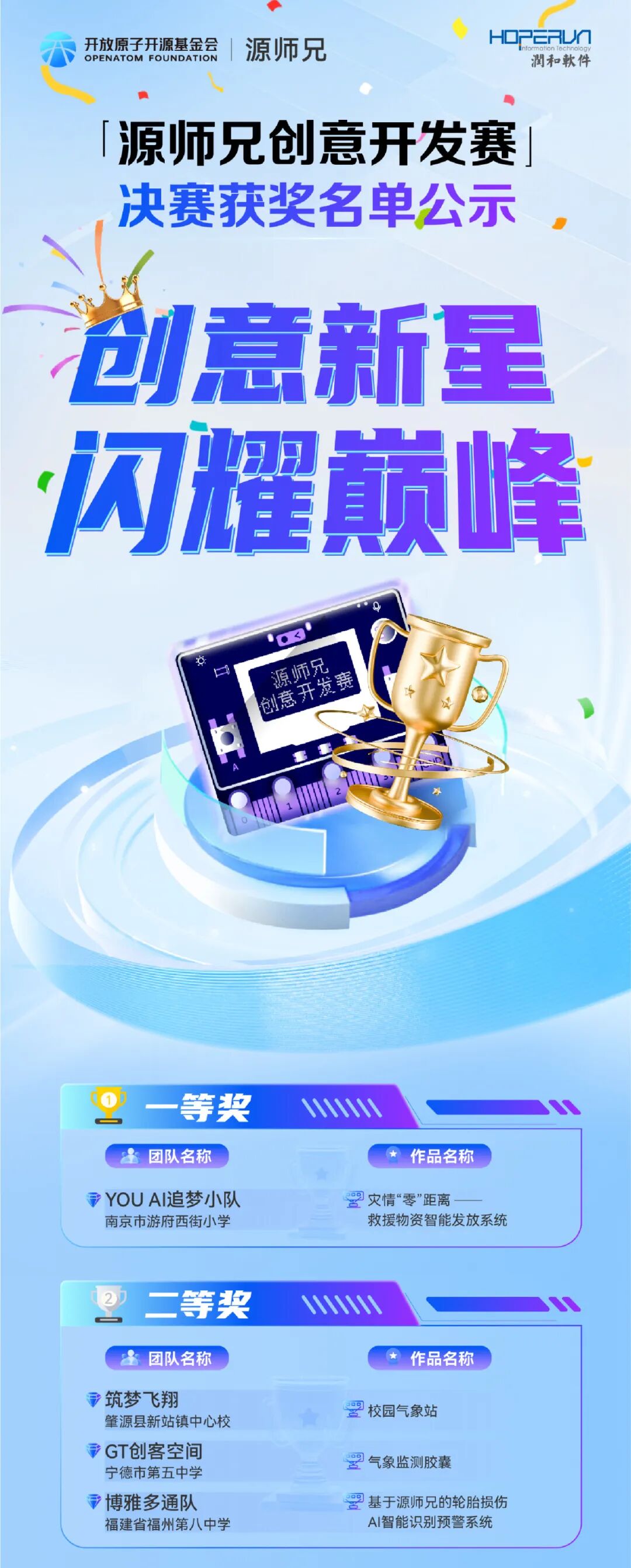 近日,由開放原子開源基金會主辦、江蘇潤和軟件股份有限公司承辦的第三屆開放原子大賽源師兄創意開發賽決賽圓滿落幕。經過激烈角逐,一批兼具創新性與實用性的原創作品脫穎而出,充分展現了中小學生對開源技術的理解力與創造力。