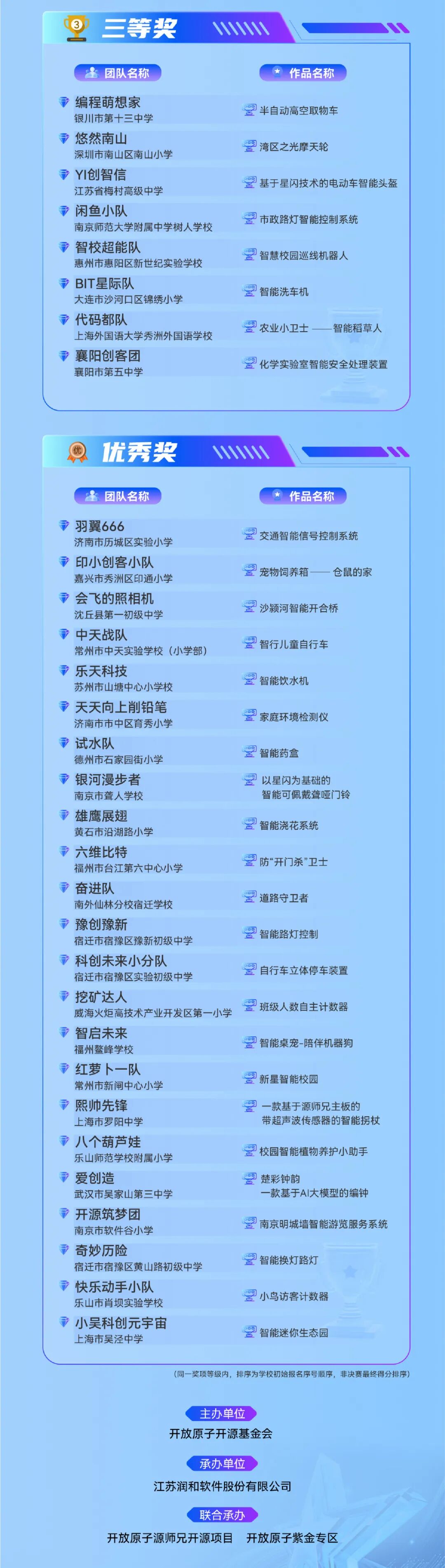 在此,向所有參賽學校及師生致以誠摯敬意!每一支團隊的傾情投入、每一項作品的匠心設計,都為青少年開源科創教育注入了鮮活力量,也為開源創新生態的發展寫下了生動注腳。未來,源師兄將持續搭建青少年科創舞臺,讓開源創新的種子在實踐中生根發芽、綻放光芒!