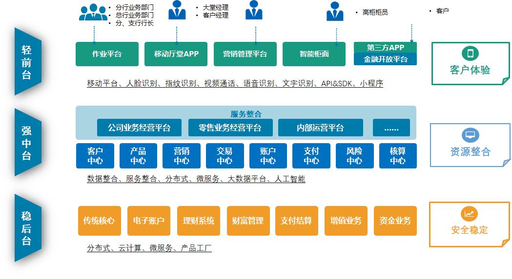 “快前臺、強中臺、穩(wěn)后臺”的IT架構體系,突出平臺化共享思維,強化服務復用能力,提升業(yè)務響應效率,搭建一種前臺輕量、中臺共享、后臺支撐的IT架構體系,在銀行數(shù)字化轉型和金融創(chuàng)新過程中起到了決定性作用;