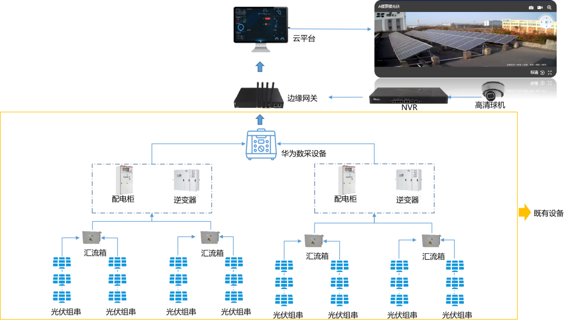 該項目利用車間屋頂、過道頂棚、停車場頂棚及辦公大樓屋頂進行光伏鋪設,,光伏鋪設覆蓋5個車間(含部分過道)、9個車棚以及辦公樓,裝機規模9.2MW;充電樁共22臺,其中20臺交流7kw,2臺直流120kw?!窭幂o助系統實現變配電房遠程視頻監控、實時告警響應,提升變配電站運行的安全性和可靠性●集成企業既有系統,解決各子系統獨立運維的痛點,實現數字化、智能化的管理●綜合配電房環境、火災、安防、門禁、視...