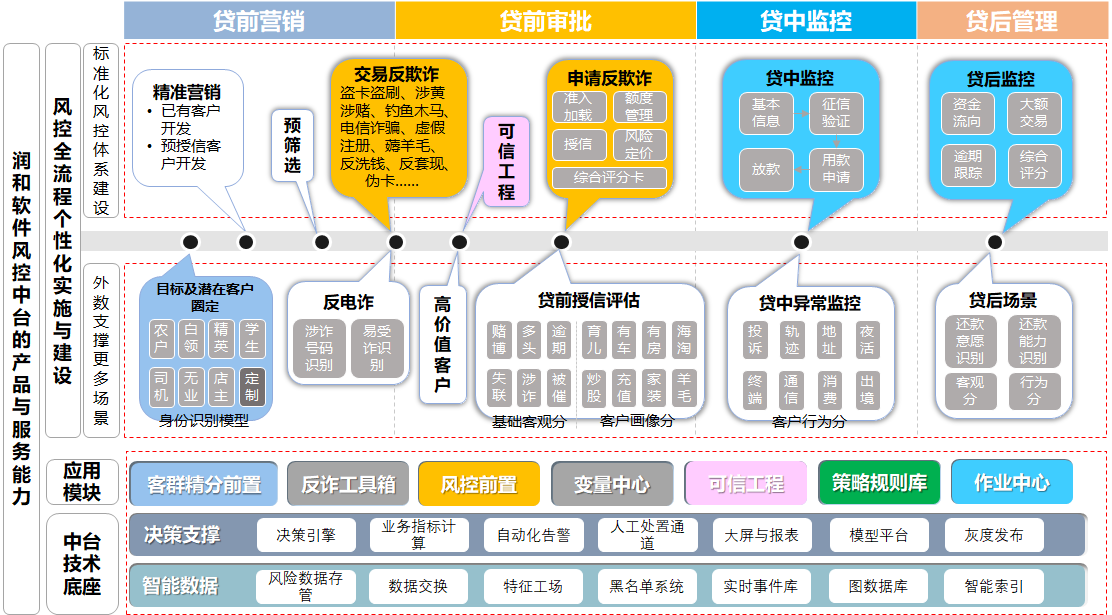 潤和軟件為銀行量身打造信貸智能風(fēng)控解決方案,貫穿貸前至貸后全流程,確保風(fēng)險全面受控。基于強(qiáng)大的中臺技術(shù)底座,我們提供靈活且高效的智能數(shù)據(jù)支持及決策平臺,輕松與客戶現(xiàn)有科技體系融合,為業(yè)務(wù)升級提供持續(xù)動力。開箱即用的應(yīng)用模塊,如客群細(xì)分、反欺詐工具等,均經(jīng)過深度抽象,實用性極強(qiáng),支持快速部署。潤和還助力建設(shè)標(biāo)準(zhǔn)化的風(fēng)控體系,從精準(zhǔn)營銷到貸后監(jiān)控,全方位打造定制化風(fēng)控模型。更引入豐富的高價值外部數(shù)據(jù)與模型接口,結(jié)合專業(yè)第三方數(shù)據(jù),為銀行信貸安全構(gòu)筑堅實屏障。