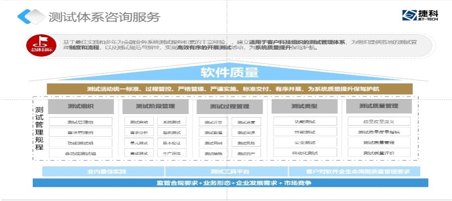 制度體系文檔構(gòu)建,包含測(cè)試工作機(jī)制;項(xiàng)目管理辦法;規(guī)程文件,包括各領(lǐng)域過(guò)程應(yīng)遵循的基本原則、過(guò)程的執(zhí)行要求、度量和裁適等;指南、模板、檢查表和樣例等。通過(guò)項(xiàng)目試點(diǎn)、持續(xù)改進(jìn)及推廣,逐步完善體系內(nèi)容。規(guī)劃組織架構(gòu),根據(jù)客戶業(yè)務(wù)發(fā)展和戰(zhàn)略定位,結(jié)合現(xiàn)狀及業(yè)內(nèi)最佳實(shí)踐進(jìn)行測(cè)試處室組織架構(gòu)及人員規(guī)劃,清晰崗位職責(zé)、保障測(cè)試工作有序開展,為人員管理提供依據(jù)。測(cè)試工具體系建設(shè),合理、必要的專業(yè)測(cè)試工具的引入與...